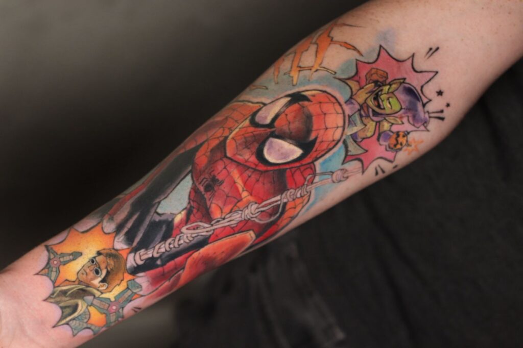 Além disso, por puxar referências da cultura nerd, esse tipo de tattoo permite contar histórias visuais completas — personagens, símbolos, cenas e universos inteiros traduzidos para a pele.